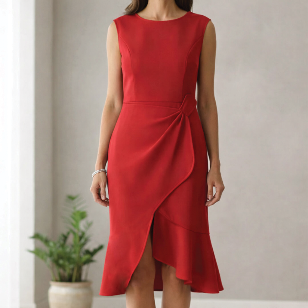 The Adeline Cocktail Dress is your go-to piece for chic gatherings and special evenings. Designed with a flattering fitted waist, graceful asymmetrical ruffle, and elegant midi length, this sleeveless dress combines comfort with timeless sophistication for effortless confidence.